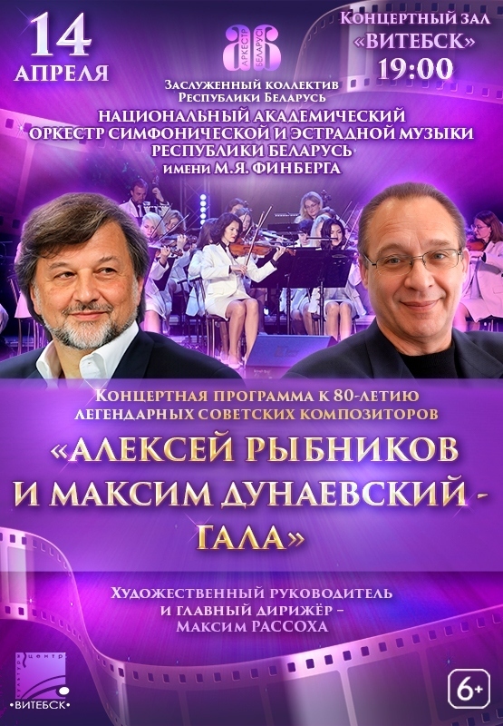 14 апреля в 19.00 в концертном зале «ВИТЕБСК» Заслуженный коллектив «Национальный академический концертный оркестр Беларуси имени М. Я. Финберга» и солисты оркестра представят концертную программу из популярных и узнаваемых произведений Максима ДУНАЕВСКОГО и Алексея РЫБНИКОВА.