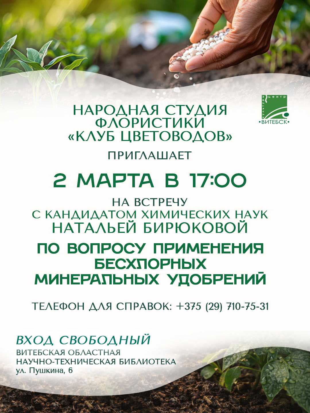 Народная студия «КЛУБ ЦВЕТОВОДОВ» приглашает на разговор, который сделает ваши растения здоровее и сильнее. Кандидат химических наук Наталья БИРЮКОВА расскажет просто о сложном: как работают бесхлорные удобрения, почему растениям нужен точный «рацион» и как наука помогает саду цвести.