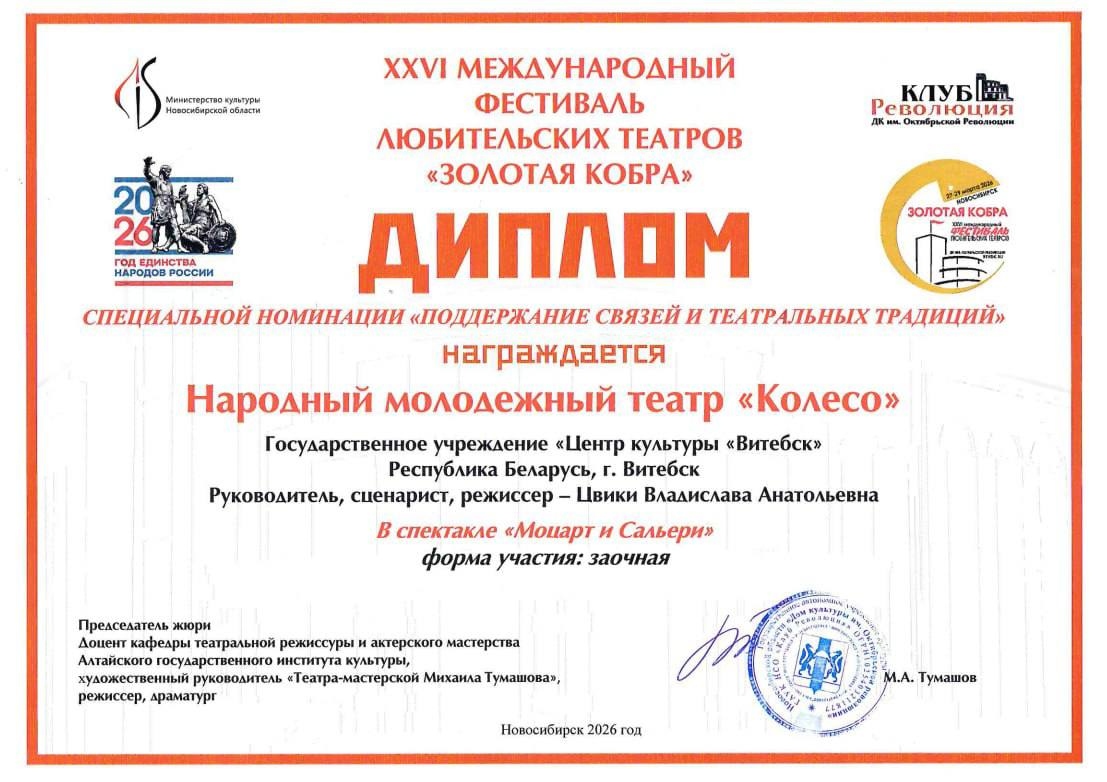 Наш народный молодежный театр «КОЛЕСО» принял участие в XXVІ международном фестивале любительских театров «ЗОЛОТАЯ КОБРА» (г. Новосибирск)